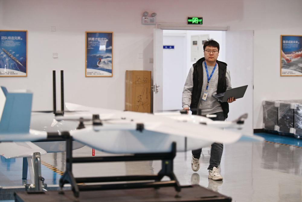 在天津滨海—中关村科技园培育的致导创新(天津)科技有限公司,工作人员准备对无人机进行调试(2月20日摄)。新华社记者李然摄