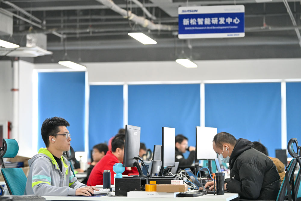在位于京津中关村科技城的天津新松智能科技有限公司,企业研发人员在智能研发中心内办公(2月20日摄)。新华社记者孙凡越摄