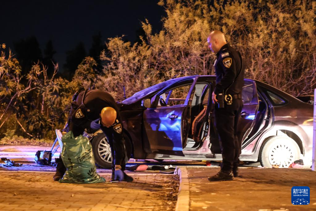 2月27日,警察在以色列北部城市凯撒利亚附近一座公交车站汽车冲撞人群事件现场采集证据。新华社发(安乔·戈什摄/基尼图片社)