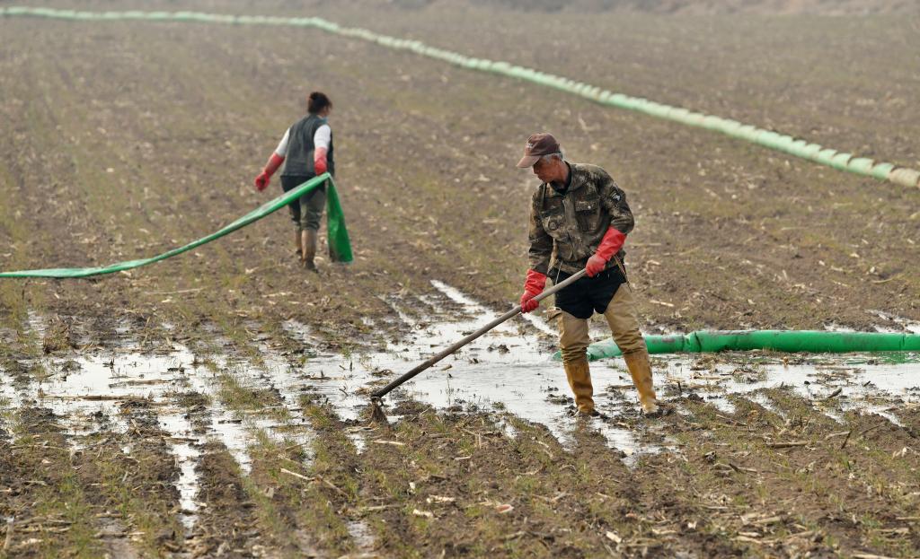 2月28日,种植户在河北沧县兴济镇南堤村旱碱麦田浇灌作业。(苑立伟摄)