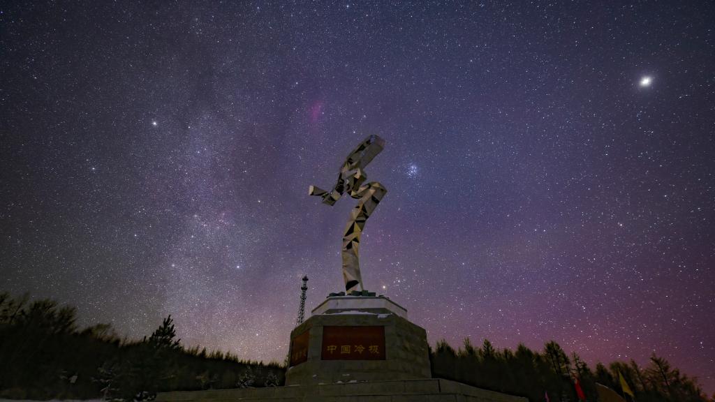2023年12月15日,在内蒙古自治区呼伦贝尔市根河市冷极村拍摄的冷极碑与昴星团。(张一林 摄)