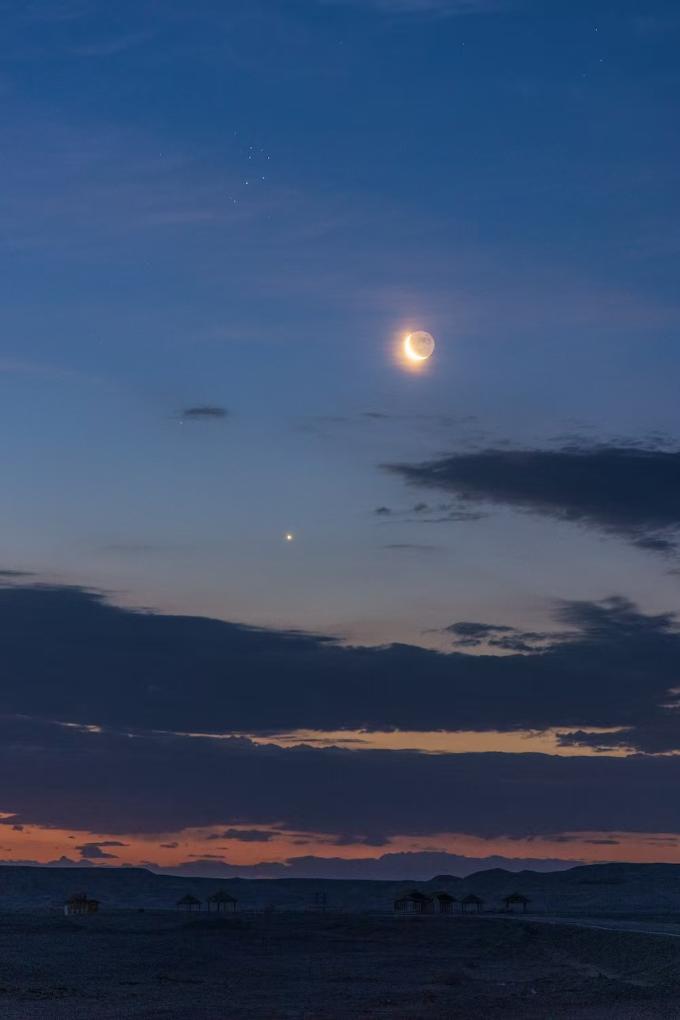 2022年6月26日,在新疆维吾尔自治区哈密市大海道景区拍摄的月伴昴星团。(戴建峰 摄)