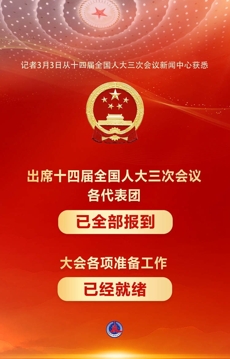 新华社北京3月3日电 记者3日从十四届全国人大三次会议新闻中心获悉,出席此次会议的各代表团已全部报到,大会各项准备工作已经就绪。