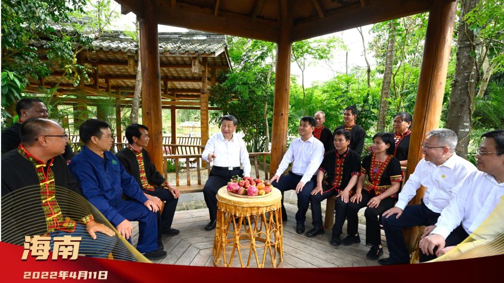 2022年4月11日,习近平在海南五指山市水满乡毛纳村,同当地干部群众亲切交谈。在村寨凉亭内,习近平同驻村第一书记、乡镇乡村振兴工作队队长、村支部书记、老党员、致富带头人代表等亲切交谈。习近平强调,推动乡村全面振兴,关键靠人。要建设一支政治过硬、本领过硬、作风过硬的乡村振兴干部队伍,吸引包括致富带头人、返乡创业大学生、退役军人等在内的各类人才在乡村振兴中建功立业。