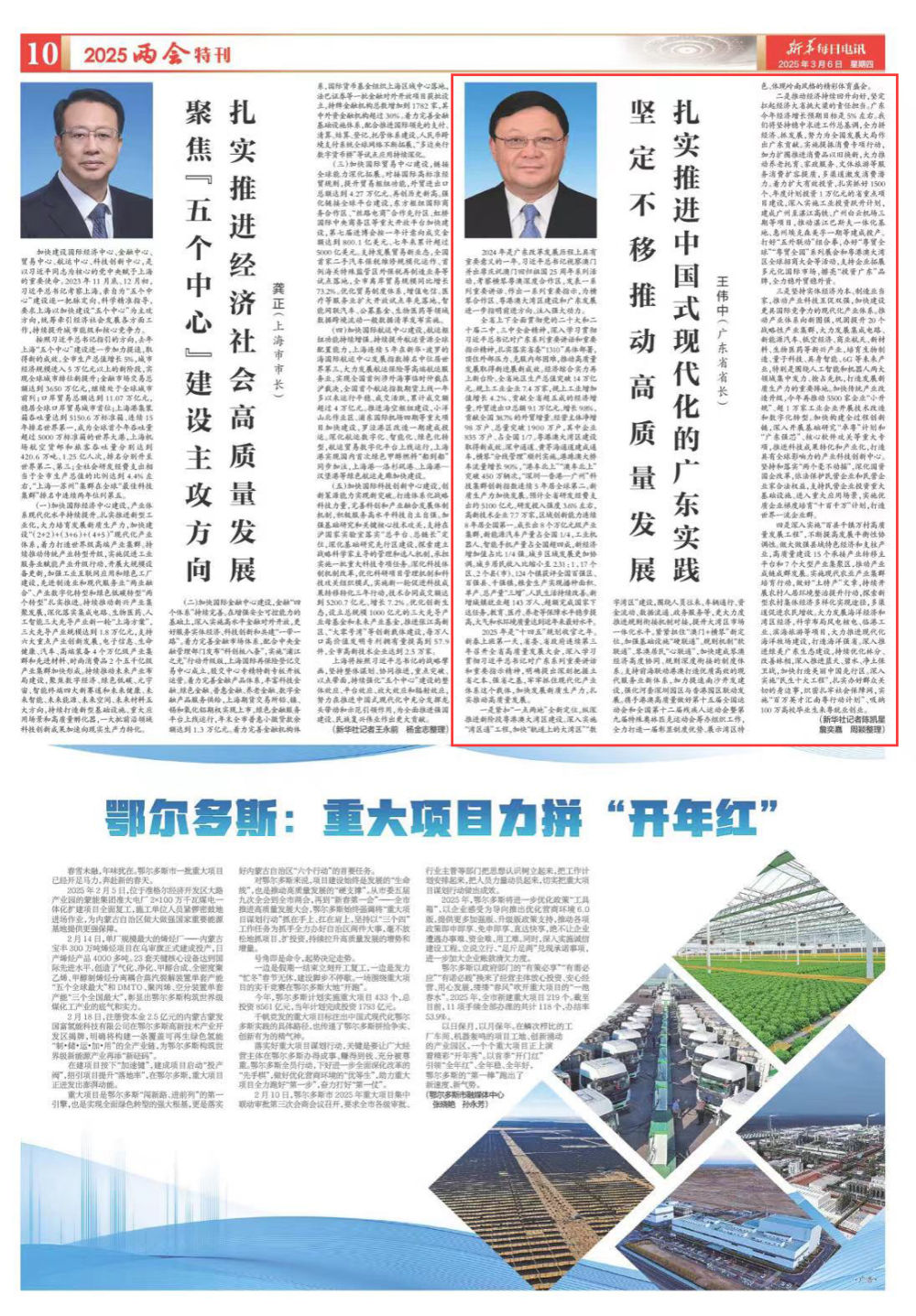 四是深入实施“百县千镇万村高质量发展工程”,不断提高发展平衡性协调性。做大做强县域特色经济和支柱产业,高质量建设15个承接产业转移主平台和7个大型产业集聚区,推动产业成链成群发展。实施现代农业产业集群培育行动,做好“土特产”文章,持续开展农村人居环境整治提升行动,探索新型农村集体经济多样化实现途径,多渠道促进农民增收。大力发展海洋经济和湾区经济,科学布局风电核电、临港工业、滨海旅游等项目,大力推进现代化海洋牧场建设,打造海洋强省。深入推进绿美广东生态建设,持续优化林分、改善林相,深入推进蓝天、碧水、净土保卫战,加快打造美丽中国先行区。深入实施“民生十大工程”,扎实办好群众关切的身边事,织密扎牢社会保障网,实施“百万英才汇南粤行动计划”、吸纳100万高校毕业生来粤就业创业。(新华社记者陈凯星 詹奕嘉 周颖整理)