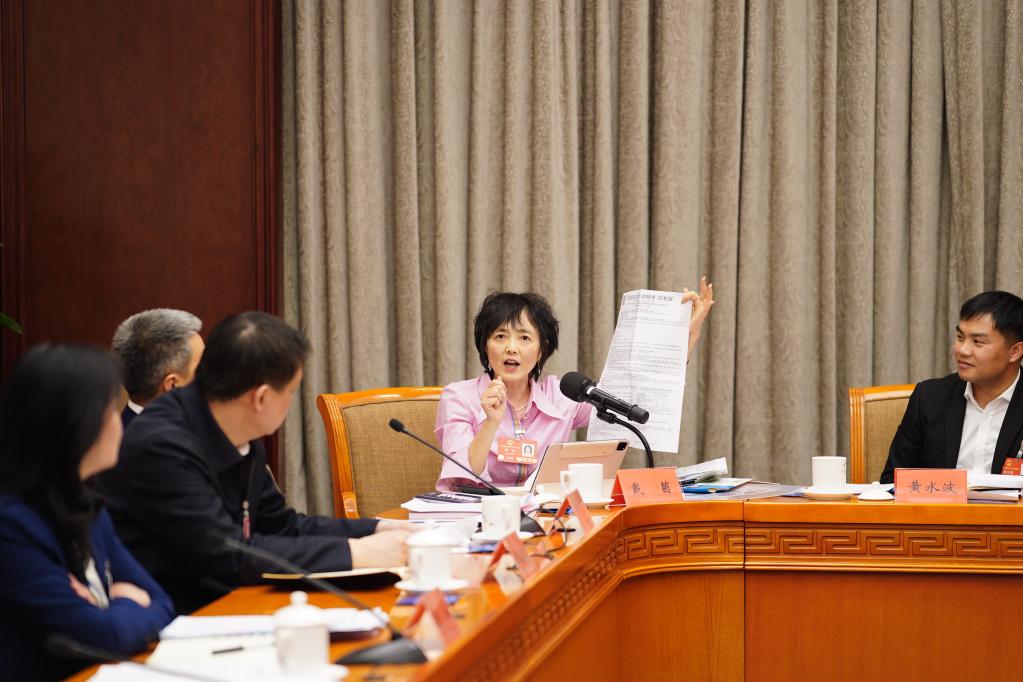 6日下午,戴茵在小组讨论上展示适老化改造后的药品说明书。唐俊 摄