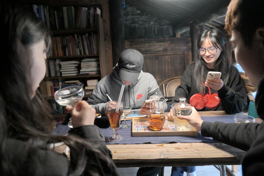 2024年4月9日,年轻消费者在福鼎白琳老街“同顺泰”茶号品尝新式茶饮料。新华社记者 林善传 摄