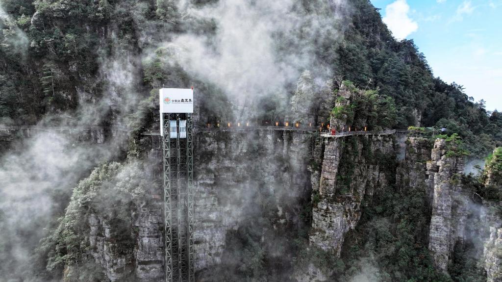 图为广西金秀瑶族自治县大瑶山盘王界景区内的悬崖挂壁无障碍游览步道和悬崖垂直观光电梯。新华社发