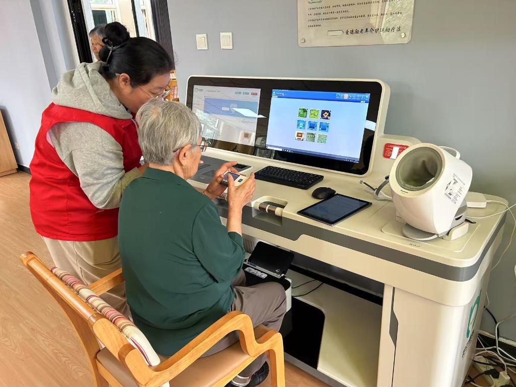 一名老人在天津市东丽区金桥街道综合养老服务中心使用智能设备进行身体检查。 新华社记者 尹思源 摄