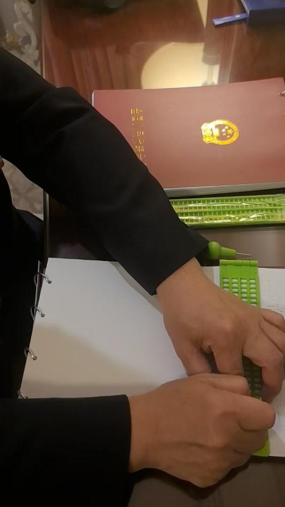 左手细细摸索盲文写字板上的凹槽,右手用盲文笔轻轻扎下,伴随细微的“咔哒”声,纸上留下一个个凹下的小圆点。