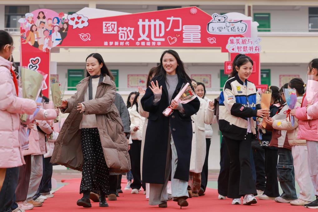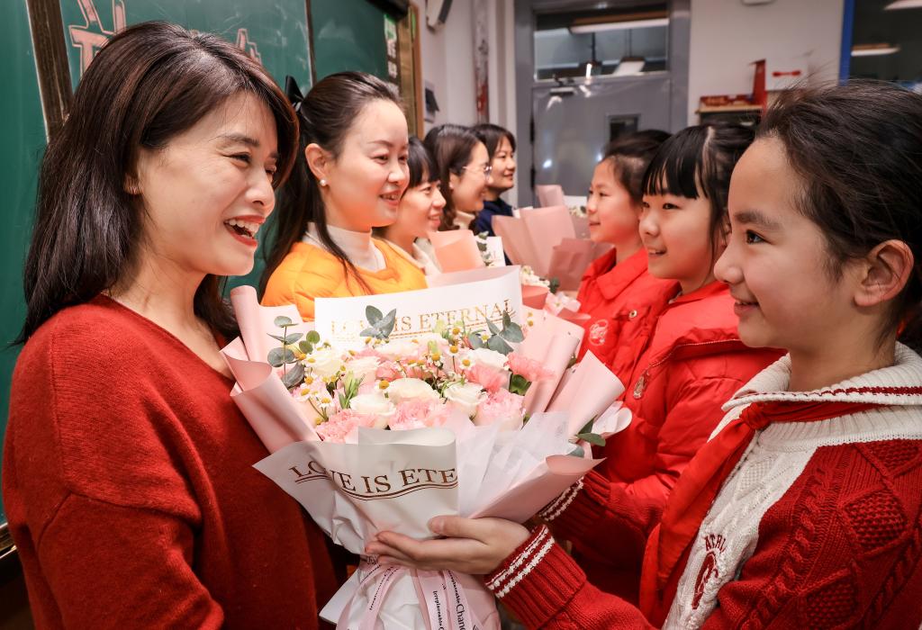 3月6日,湖北省武汉市未来实验美林小学学生为女教师献上鲜花。新华社发(赵军 摄)