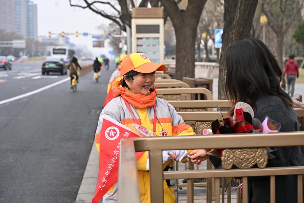 3月7日,北京市东城区建国门街道的工作人员为北京站口东公交站的公共文明引导员(左)送上鲜花并致以节日的祝福。新华社记者 李鑫 摄