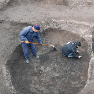 刘伟伟(中)和工人师傅正在探方中清理灰坑。新华社记者 张哲 摄