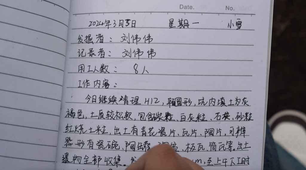 当天下着小雪,这些也被刘伟伟写在探方日记里。“我们会时刻关注天气预报,一般的雨雪天气是不会影响我们去考古工地的。”刘伟伟说,“当然,考古工作是一个很复杂的工程,不只是在一线工作。如果室外是极端天气,那我们就在室内进行资料整理,清洗陶片、拼对、挑选标本、整理报告等。”