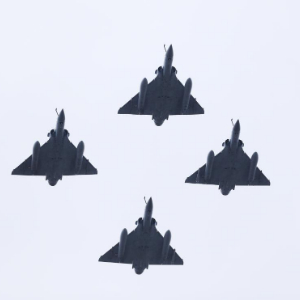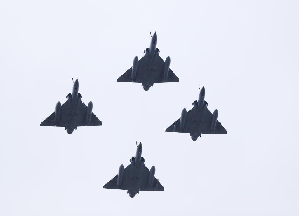这是2021年7月14日在法国巴黎协和广场国庆阅兵式现场拍摄的战斗机编队。新华社记者 高静 摄