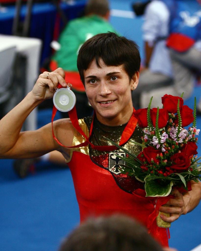 ↑2008年8月17日,丘索维金娜在北京奥运会女子跳马颁奖仪式后展示银牌。 新华社记者 任珑 摄
