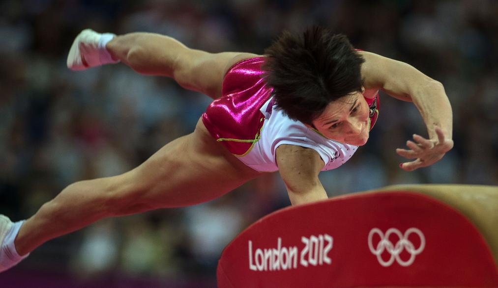 ↑2012年8月5日,丘索维金娜在伦敦奥运会女子跳马决赛中。最终她获得了第五名。新华社记者 程敏 摄