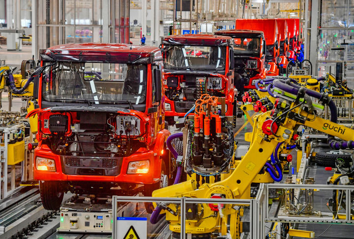 近年来,汽车出口成为陕西外贸新的增长点。图为工业机器人在陕汽新能源重卡基地生产线上作业。(图片由陕西省委办公厅提供)