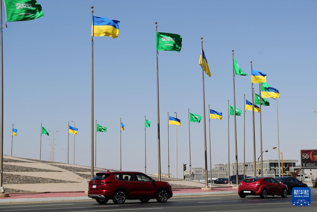 3月10日,在沙特阿拉伯吉达,沙特阿拉伯和乌克兰两国的国旗在道路旁飘扬。新华社记者 王东震 摄