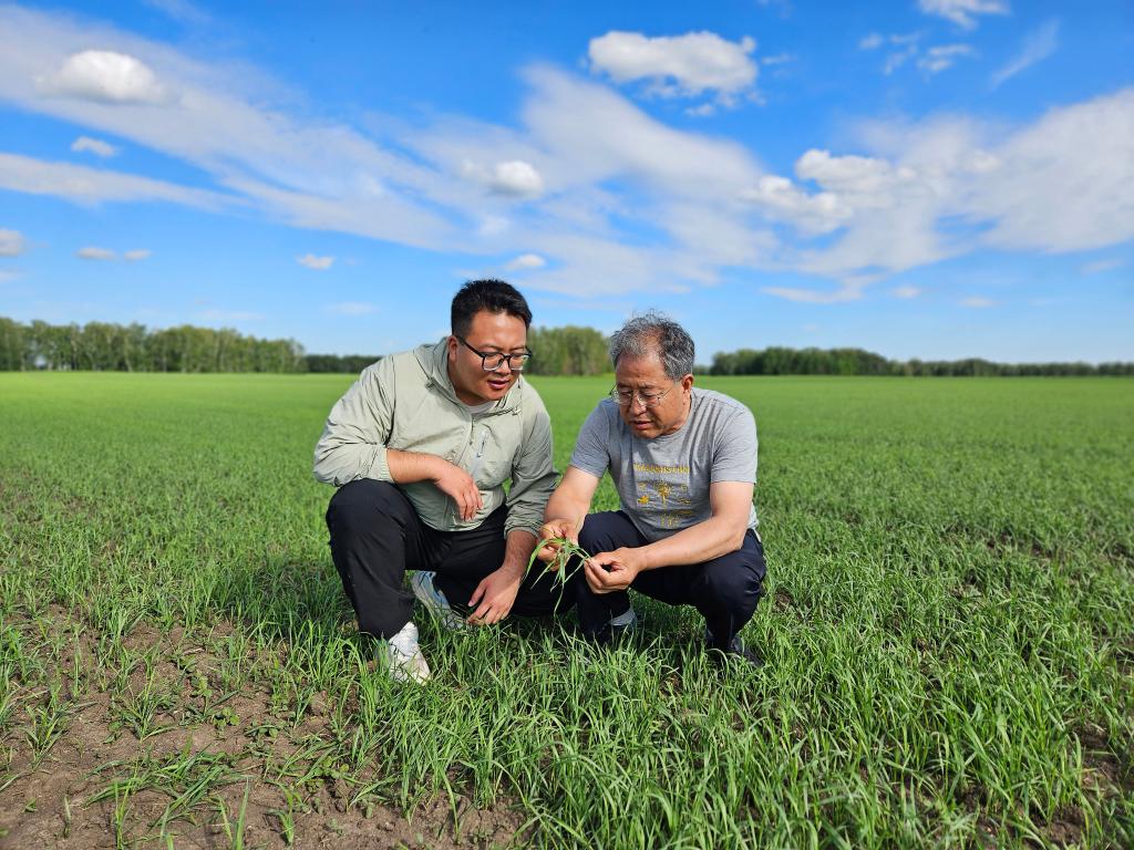 2024年6月19日,西北农林科技大学教授张正茂(右)与学生在哈萨克斯坦北哈州的农业示范园调查小麦生长情况。新华社发