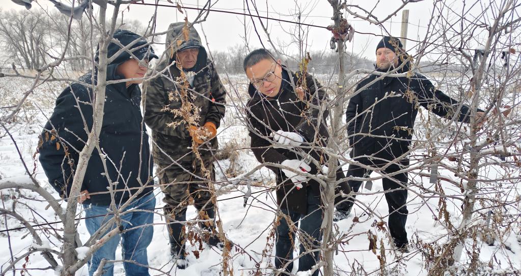 2024年12月8日,西北农林科技大学教授张东(右二)在吉尔吉斯斯坦楚河州的中吉果木良种繁育示范园进行冬季苹果苗木修剪技术培训。新华社发