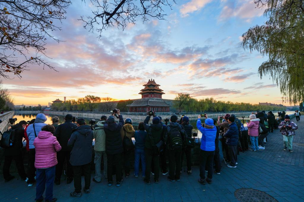 2024年11月29日清晨,摄影爱好者在北京故宫西北角楼拍摄朝霞。新华社记者 陈晔华 摄