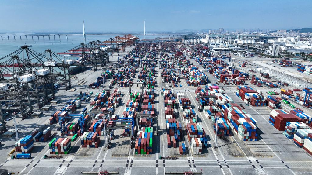 厦门港是国家重点建设的四大国际航运中心之一,有万吨级以上泊位82个,2024年集装箱吞吐量达1225.47万标箱。海沧港区远海全自动化码头,岸桥高耸,一艘艘远洋货轮有序进港靠泊,无人集卡往来穿梭,一排排集装箱货柜待发,又一批国产汽车整齐排列,头尾相连进入船舱……