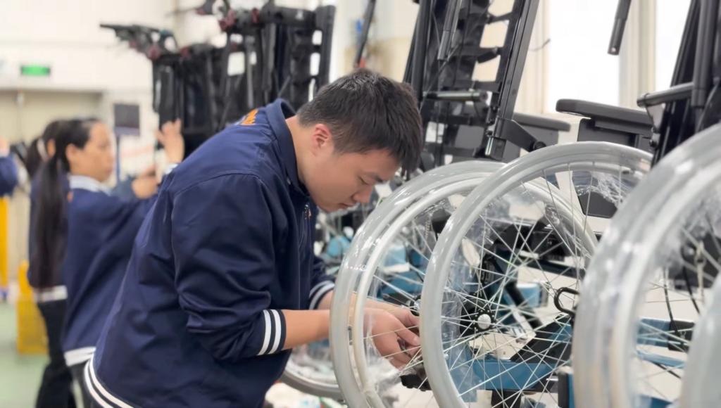 在安维车件(厦门)有限公司车间,工人在组装轮椅的配件(2025年2月26日摄)。新华社记者 付敏 摄