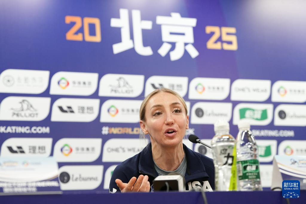 3月12日,美国选手克里斯滕·桑托斯·格里斯沃尔德在发布会上回答记者提问。新华社记者 鞠焕宗 摄