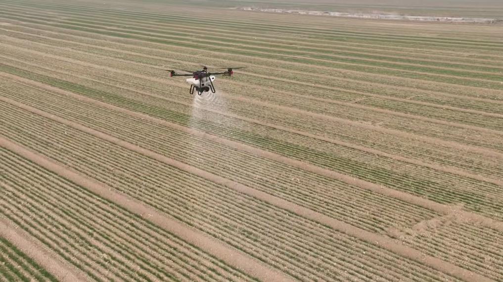 图为一架正在陕西省渭南市临渭区官邸镇庙王村麦田进行作业的无人机。(受访者供图)