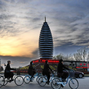 市民在河北雄安新区容城县县城道路上骑行(2018年3月29日摄)。新华社记者 牟宇 摄