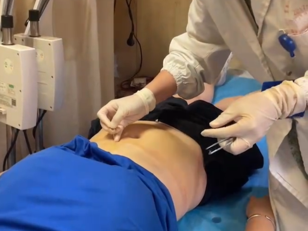 杭州市东新街道社区卫生服务中心体重管理门诊,中医师在为就诊者进行中医埋线理疗。(受访者供图)
