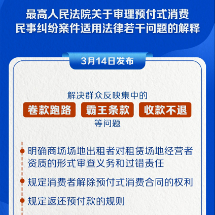 最高人民法院3月14日发布《最高人民法院关于审理预付式消费民事纠纷案件适用法律若干问题的解释》,解决预付式消费领域群众反映集中的卷款跑路、霸王条款、收款不退等问题,更好保护消费者权益。