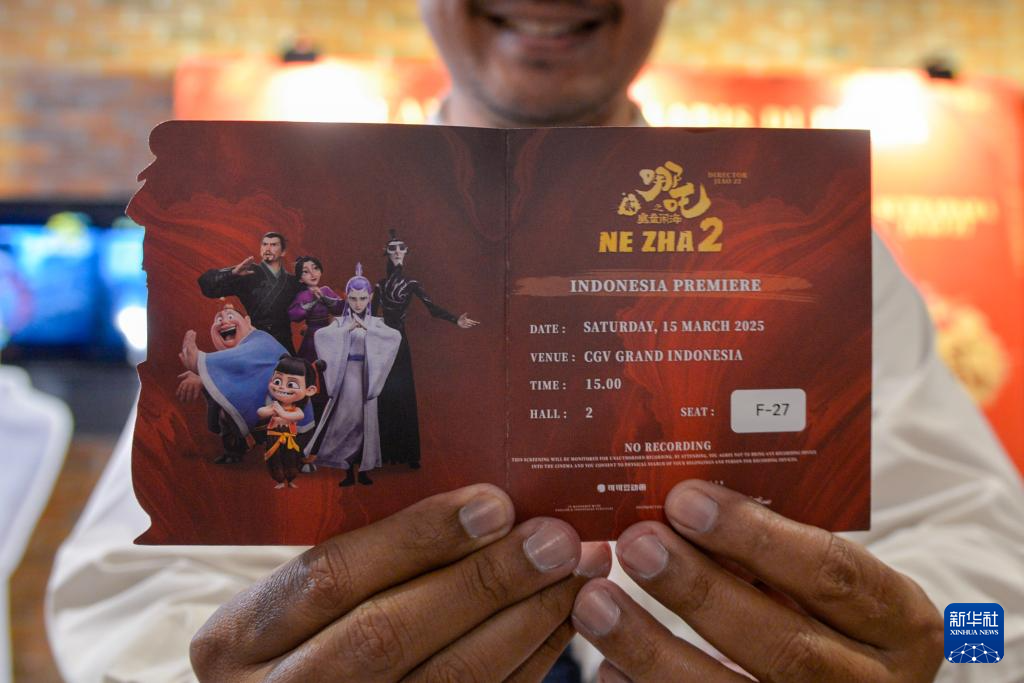 3月15日,在印度尼西亚雅加达,一名参加《哪吒之魔童闹海》首映礼的观众展示电影票。新华社记者 徐钦 摄