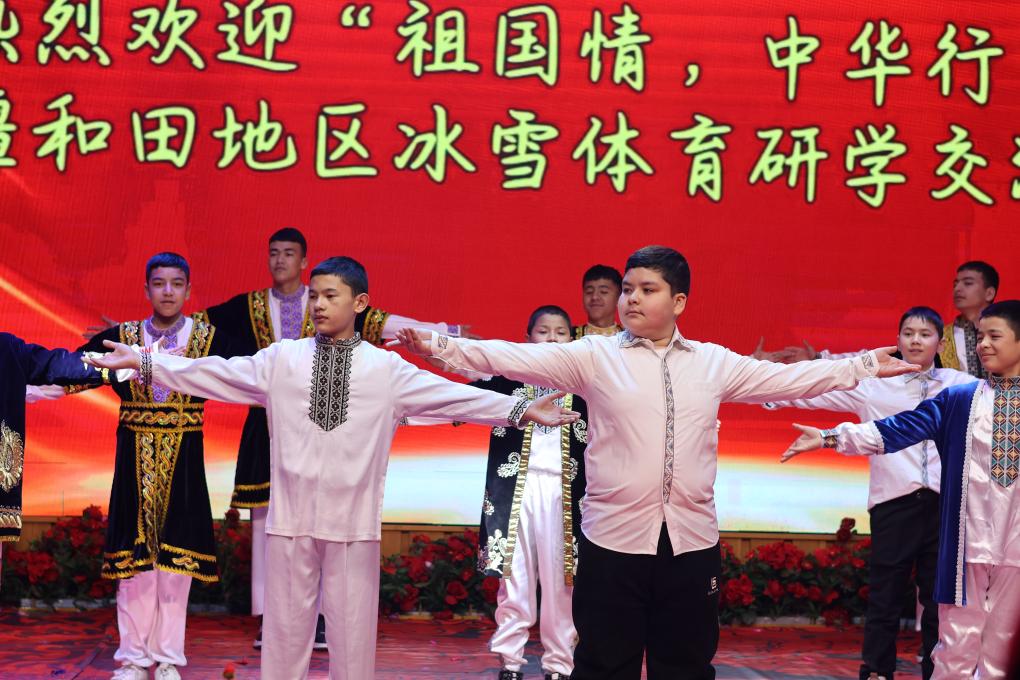 来自新疆和田地区的学生们在舞台上身着民族服饰进行舞蹈表演。