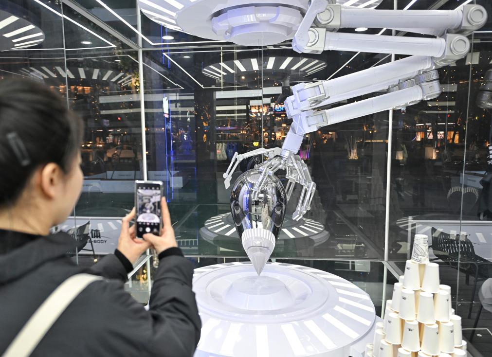 2025年1月5日,市民在位于成都交子大道的三体四维空间拍摄“水滴”。新华社记者 刘坤 摄
