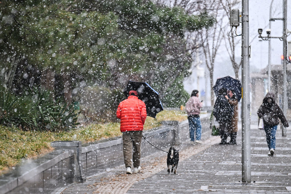 行人在北京宣武门附近用手接落下的雨雪(2025年3月15日摄)。新华社记者 李鑫 摄
