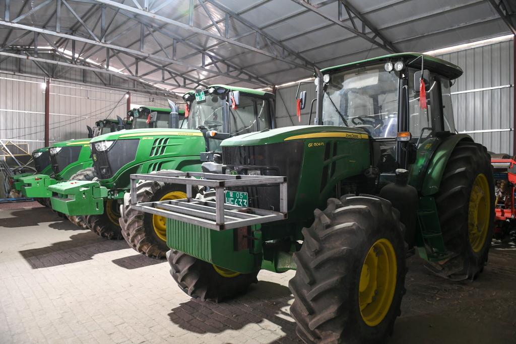 两台崭新的拖拉机仅车轱辘就一人多高。陈胡日查说,这种拖拉机省油、效率高,一天能种300多亩地。