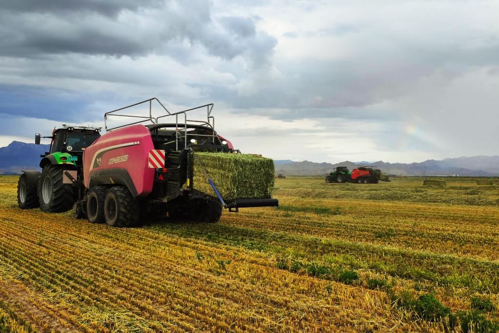 在青海奔盛草业有限公司的饲草基地,工作人员在打捆饲草。(受访者供图)