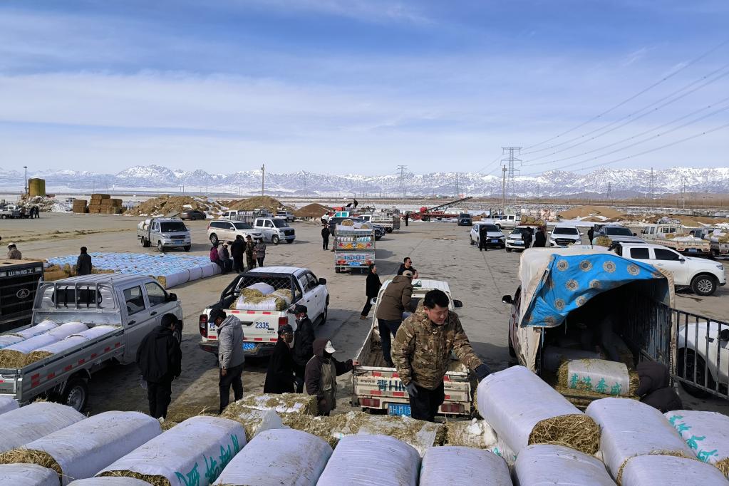 2025年3月,牧民在青海奔盛草业有限公司的饲草储备库领取饲草。(受访者供图)