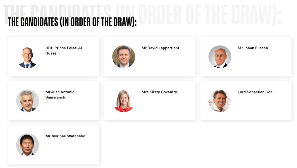 在国际奥委会近131年的历史上,一共产生过九位主席,其中八人来自欧洲,另外一位来自美国。根据《奥林匹克宪章》,主席候选人必须是现任国际奥委会委员。本次参与竞选的共有七人,其中欧洲四人,分别是国际奥委会副主席小萨马兰奇(65岁,西班牙)、世界田联主席塞巴斯蒂安·科(68岁,英国)、国际自行车联盟主席大卫·拉帕尔蒂安(51岁,法国)和国际雪联主席约翰·埃利亚施(63岁,瑞典和英国双重国籍);亚洲两人,分别是国际奥委会执委费萨尔·侯赛因(61岁,约旦)和国际体操联合会主席渡边守成(66岁,日本);非洲一人,国际奥委会执委、运动员委员会前主席柯丝蒂·考文垂(41岁,津巴布韦)。