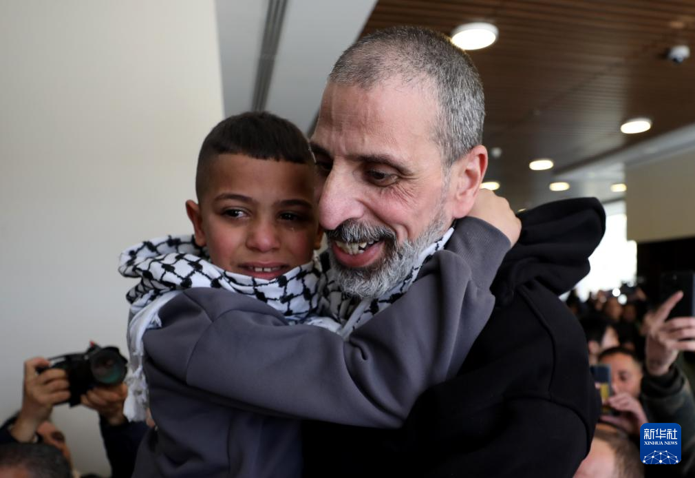 2月1日,在约旦河西岸城市拉姆安拉,人们拥抱获释的巴勒斯坦人。以色列当天释放了183名被扣押人员。新华社发(艾曼·诺巴尼 摄)