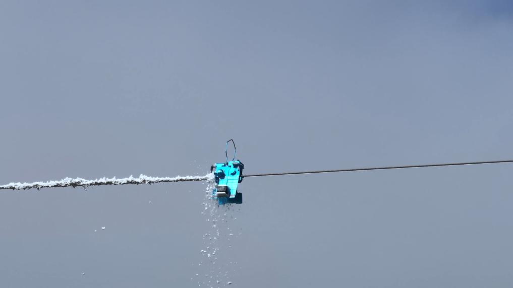 我的工作就是在输电线路上除冰。除冰前,承担僚机任务的小无人机先起飞,观察空中情况,紧接着大载重无人机装好夹子,夹起我飞到空中,将我投放到线路上。这是一项精细的工作,空气中的气流和地面不一样,时机和位置的把握很重要,需要地面与空中精密配合。
