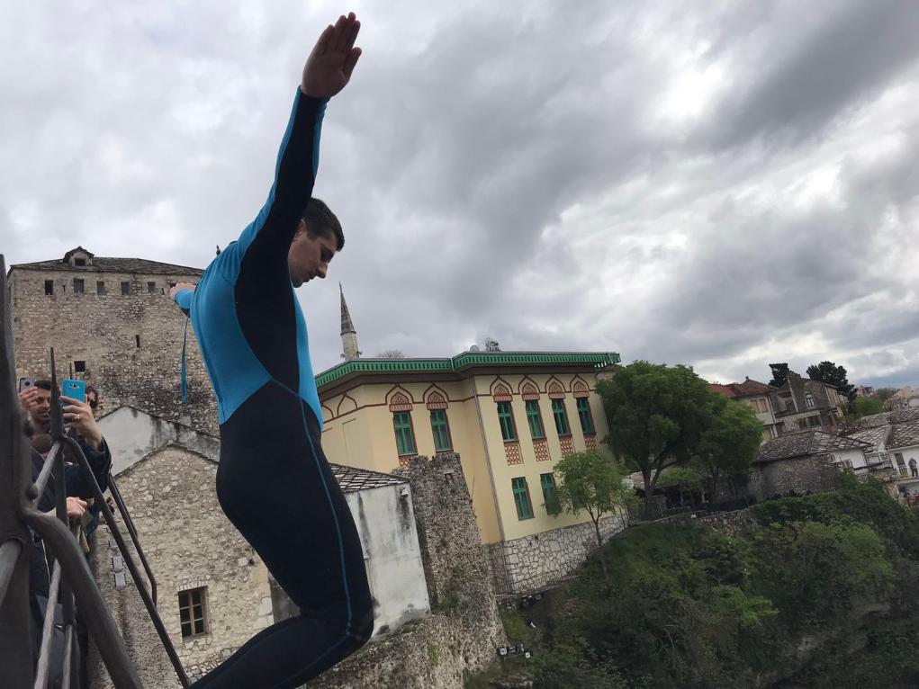 这是在波黑南部城市莫斯塔尔,跳水人埃尔明从莫斯塔尔古桥最高处起跳(2019年4月11日手机拍摄)。新华社记者张修智摄
