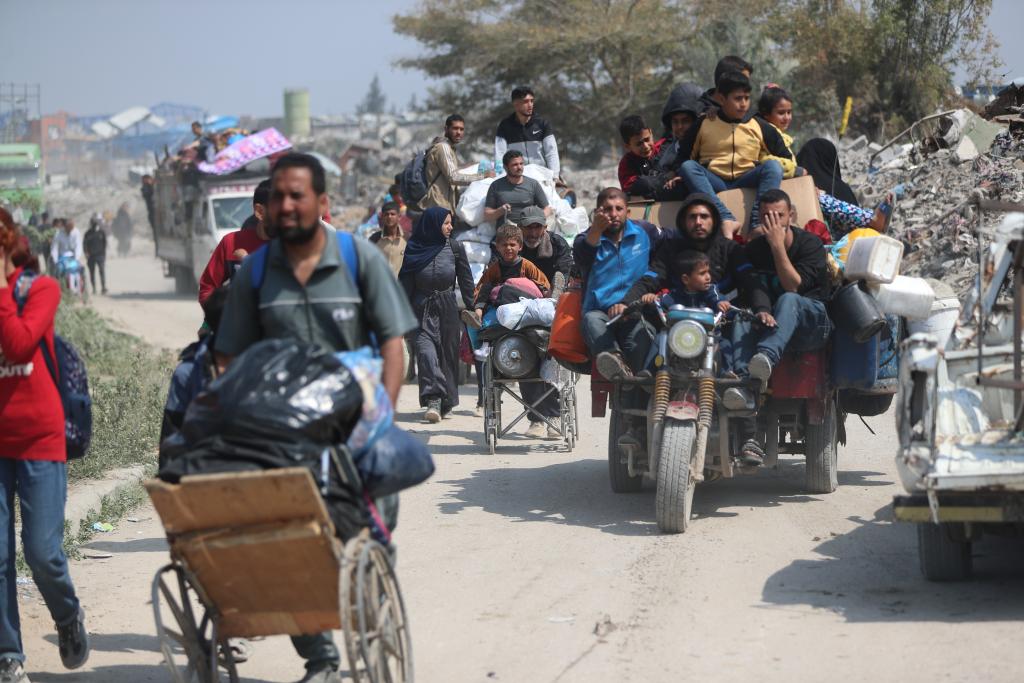 3月18日,被迫逃离加沙地带北部拜特哈嫩的巴勒斯坦民众经过加沙城。新华社发(马哈茂德·扎基摄)