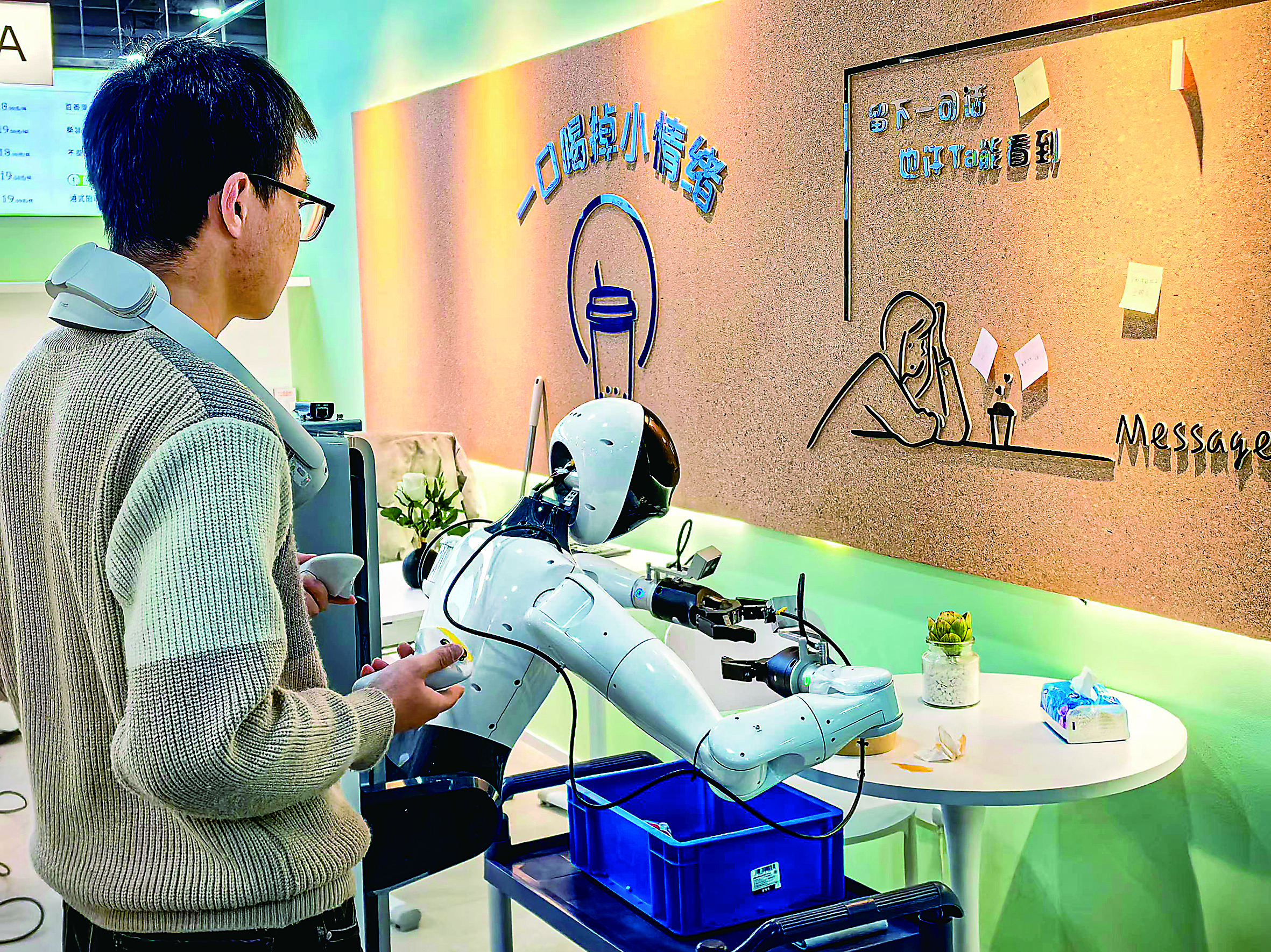 在智元新创技术有限公司数采中心,数据采集员“教”机器人擦桌子。(新华社记者龚雯 摄)