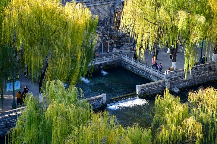 2024年12月7日,游客在济南环城公园内观赏黑虎泉。新华社记者 朱峥 摄