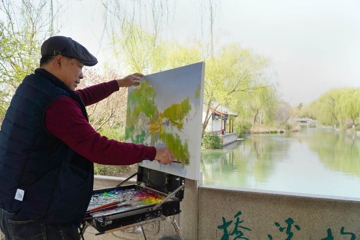 2024年3月21日,在济南市大明湖,一名绘画爱好者在描绘春日风景。新华社记者 徐速绘 摄