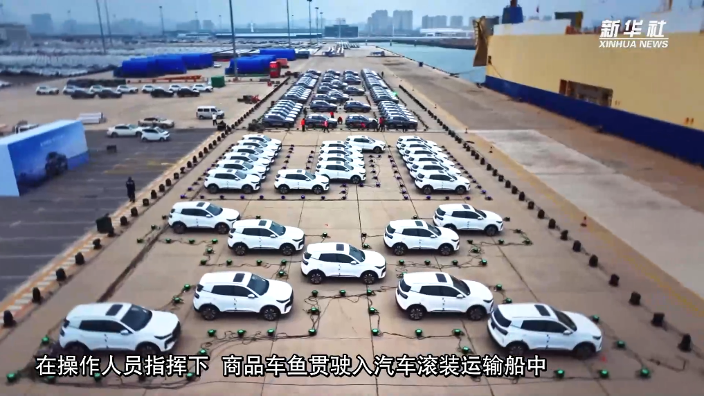 碧海蓝天之下,在大连汽车码头堆场,数以万计的全新商品车整齐排放。在操作人员指挥下,商品车鱼贯驶入汽车滚装运输船中。