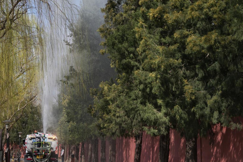 记者在位于北京东四环的红领巾公园里看到,一辆水车尾灯双闪、缓缓行进,站在车上的工作人员手持高压水枪对圆柏开展冲淋作业,花粉顺着水流不断落地。另一旁,园林工作人员对开花较多的枝条进行修剪。